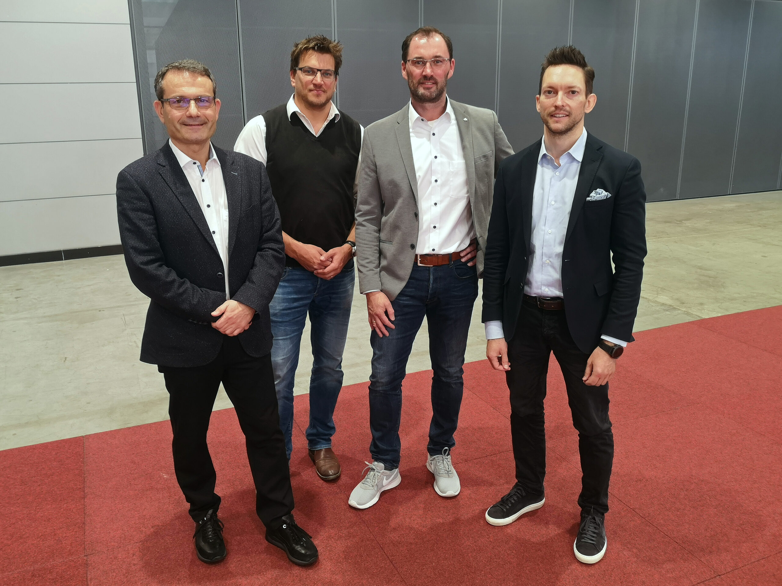 Luigi Greco (Gesacon), Elmar Schilter und Berthold Ruck (Prefa) sowie Markus Tschanter (Bendex) anlässlich der Vertragsunterzeichnung